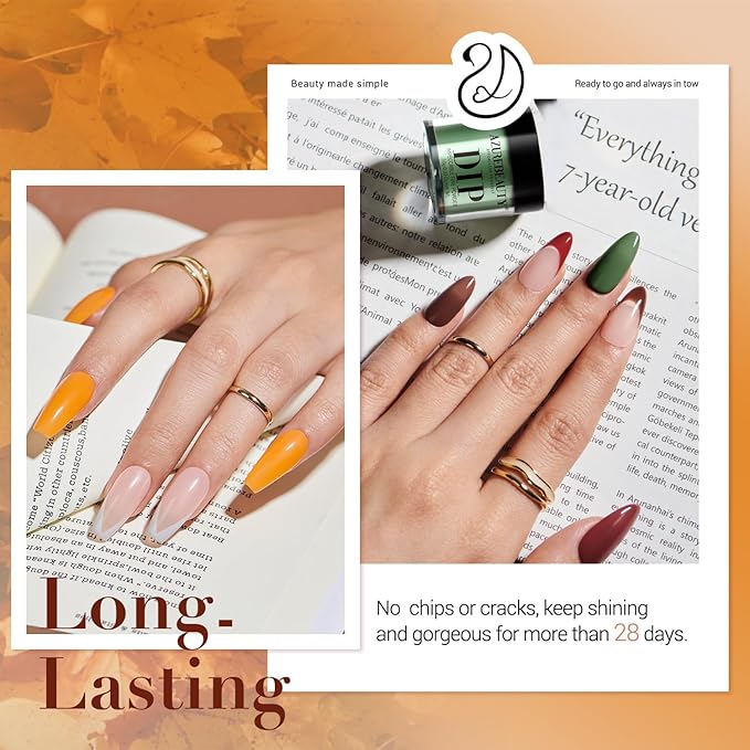 - Long Lasting Vibrant Shades: AZUREBEAUTY nail dip powder kit starter set is long-lasting and anti-chipping, anti-peel off. The color is full and natural-looking, light, and has an impeccable shine finish. It can keep the nail art gorgeous and shiny for about 28 days with proper application
