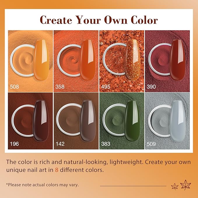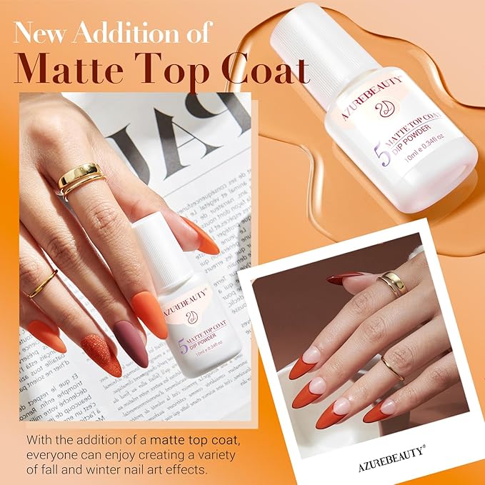 - 8-Color Upgraded Starter Kit: AZUREBEAUTY 30 Pcs fall theme dip nails powder starter kit: 8*10 g (0.33 Oz) color powder, 4*10 ml dip powder liquid set(base coat/activator/top coat/matte top coat), 2*liquid brush replacement, 1*nail brush,1*nail file, 1*nail buffer, 1*dip powder recycling tray. What's more, 10*nail sticks and 2*orangewood stickers are added in the kit for color testing as well as ease of use