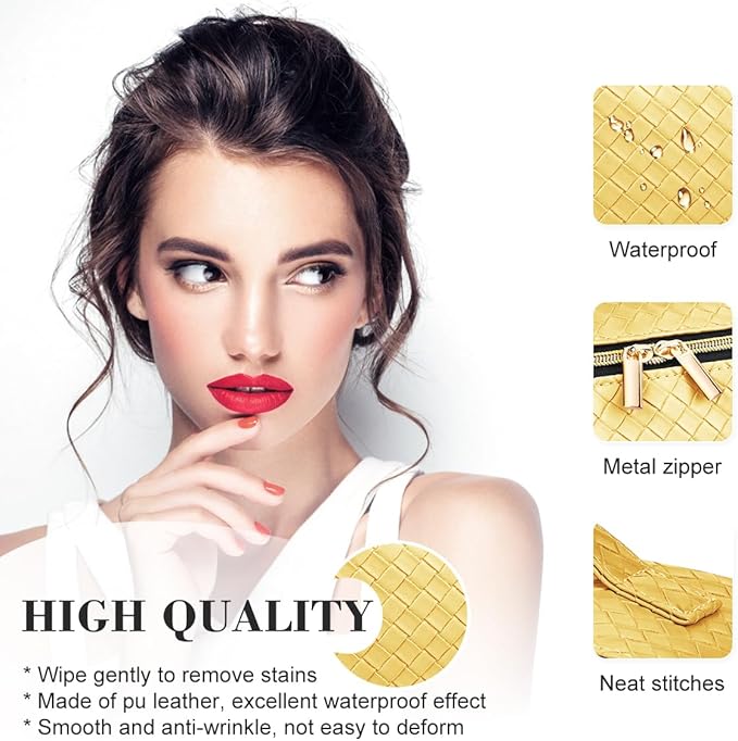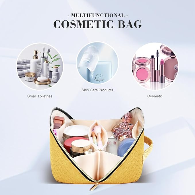 - 【Large Capacity】: This waterproof cosmetic bag features a 180°large opening design and internal compartments, providing ample storage space for your cosmetics. Our PU leather makeup bag is perfect for long trips or everyday use thanks to its spacious interior storage space that not only allows your cosmetics to organize more and tidier, but also allows you to easily access everything on the go.