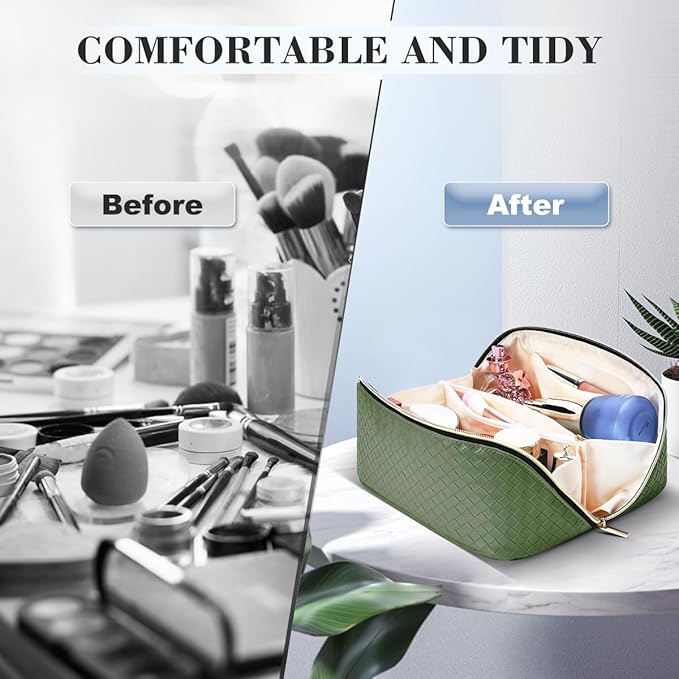 - 【Large Capacity】: This waterproof cosmetic bag features a 180°large opening design and internal compartments, providing ample storage space for your cosmetics. Our PU leather makeup bag is perfect for long trips or everyday use thanks to its spacious interior storage space that not only allows your cosmetics to organize more and tidier, but also allows you to easily access everything on the go.