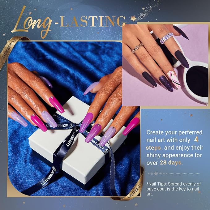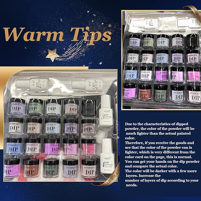 - 【No Need Nail Lamp Curing & Easy Application】AZUREBEAUTY dip powder nail starter kit doesn't need an LED nail lamp to cure, and dry faster and is skin-friendly, which can avoid turning skin black and damaging nails. Easy to apply, suitable for beginners and professional nail salons