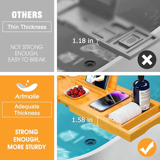 - 💟IDEAL GIFTS - Artmalle luxury bamboo bathtub caddy tray table is a unique and practical gift that not only provides convenient bathroom storage, but also adds a natural and cozy atmosphere to the bathroom. Whether it's a birthday gift, a wedding souvenir, a housewarming gift or a holiday gift, a bamboo bathtub tray can bring surprise and joy to the recipient.