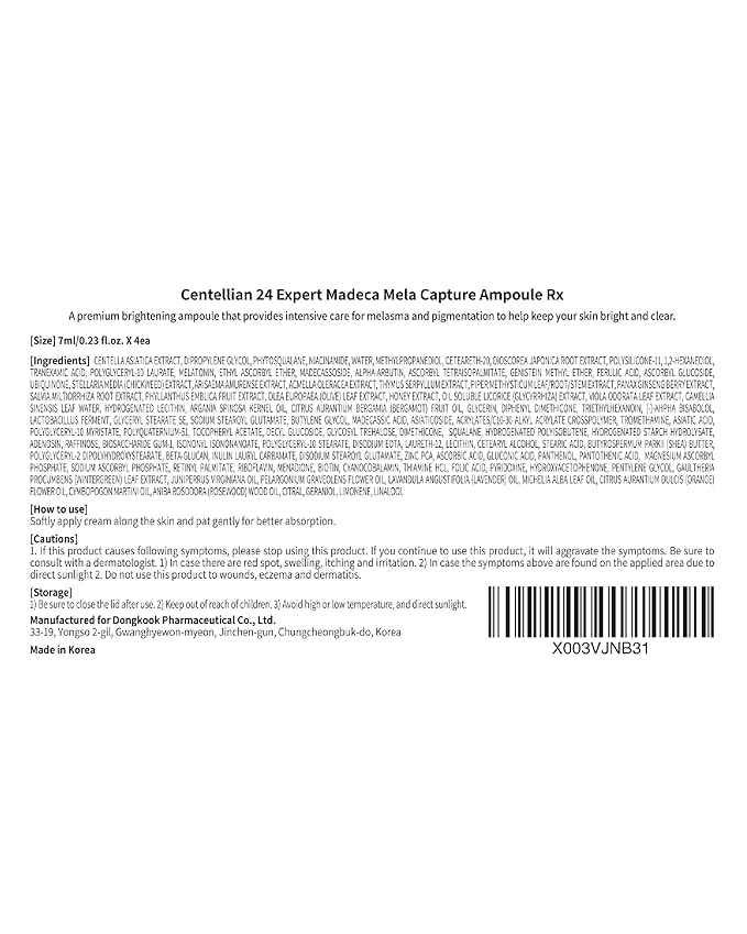 - CENTELLIAN 24 EXPERT MADECA CAPTURE AMPOULE RX (Season 2, 7ml/0.2fl oz x 4 pcs) - This powerful premium solution promotes a more even and radiant complexion with visible improvement.