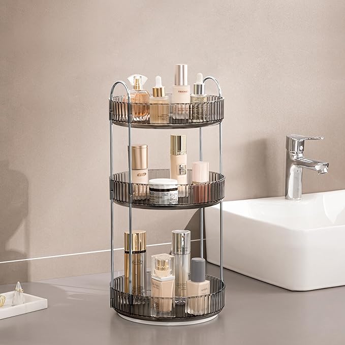 360 Rotating Makeup Organizer Clear Gray 3 Tier Bathroom Organizer Spinning Perfume Organizers, Skincare Organizers Dresser Organizer Makeup Carousel with Silver Handle Cosmetic Brush Storage