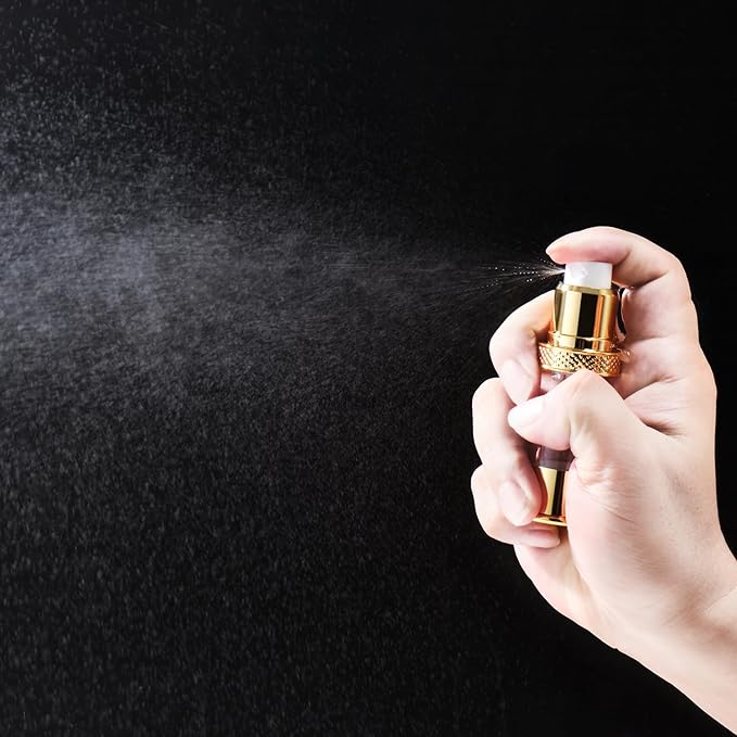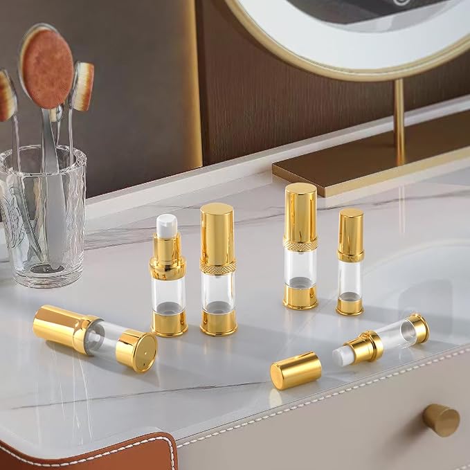 golden airless pump bottle with travel bag set with labels empty refillable cosmetic pump travel size containers hair oil, lotion and other liquids 5ml 10ml 15g(12 Packs)
