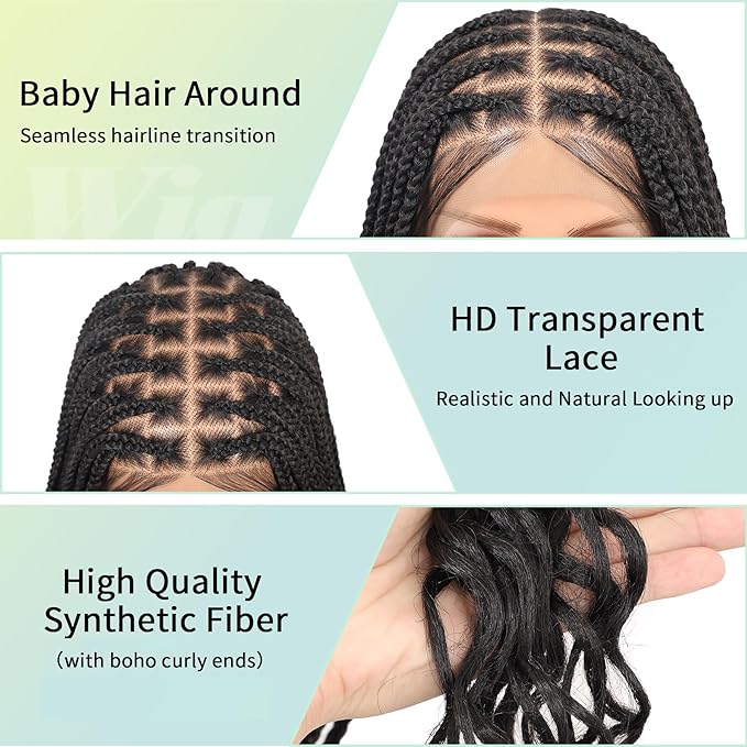- [Unique Boho Hairstyle] Fecihor HD lace braided wigs were designed by professional hair stylists, which combined braids and curls with a very natural transition, with hd lace front part looking up like your own hair. Eye-catching knotless box braid wig with boho curls. The natural transition and nice construction alone is enough to get all eyes on this box braids wigs, but this style also features curls at the ends to wow you even more. The lace front box braided wigs are literally everything.