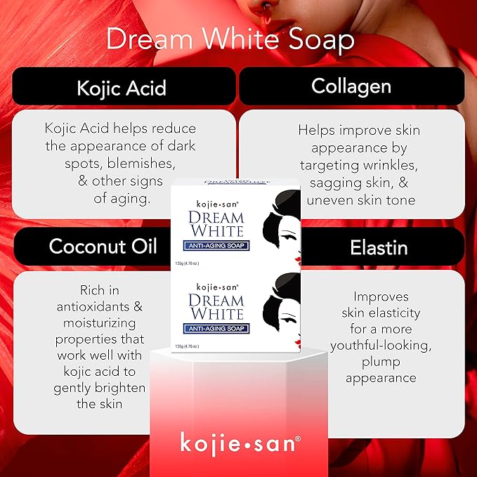 Kojie San Dream White Soap - Skin Brightening Kojic Acid Soap with Collagen, Elastin & Coconut Oil - 135g x 2 Bars