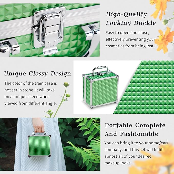 Color Nymph Beginner Makeup Kit For Teens With The Small Cosmetic Train Case Included 24-Colors Eyeshadow Palette Blushes Bronzer Highlighter Lipstick Brushes Mirror(Green)