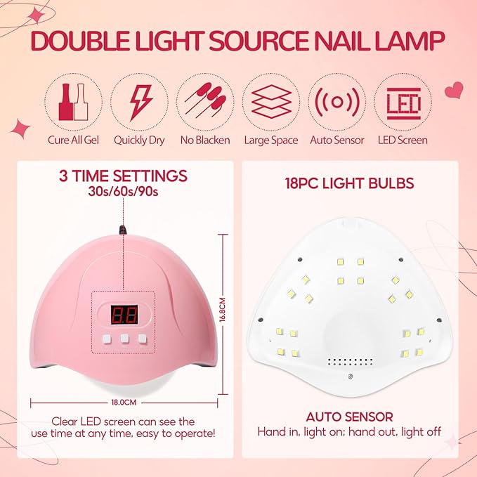 - ❤ 36W Nail Lamp: This 36W nail dryer has 3 curing modes, 30s,60s,90s(countdown display), 1-2 minutes to cure gel nail polish. And this u v lamp contains 18 led small light beads and can cure each nail in all directions. Smart nail lamp, hand in, the light is on; hand out, the light is off.
