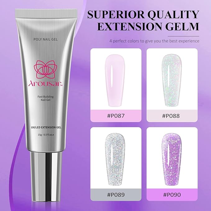 - [Classic and Natural Color] 4 colors poly nail gel kit, 15ml*4, meeting your daily manicure naidemands. Soft and nude color pink glitter makes your nails look more clearer while refining your nail shape, showing your unique beauty in any occasion.
