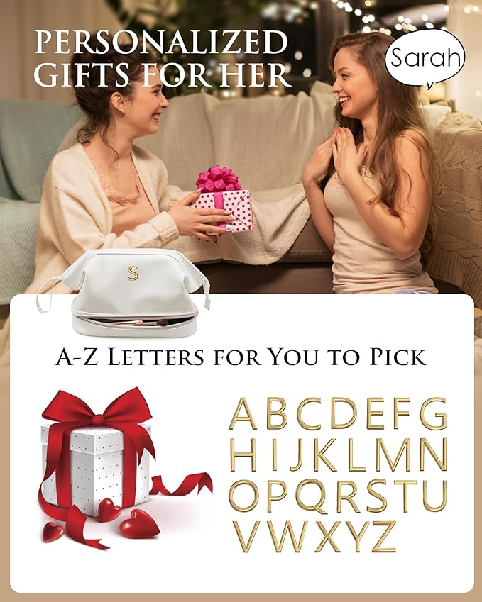 Women Birthday Gifts, Initial Large Makeup Bag, Personalized Double Layer Cosmetic Bag with Makeup Brush Organizer, Birthday Gift for Women/Girl Bridesmaids Gift