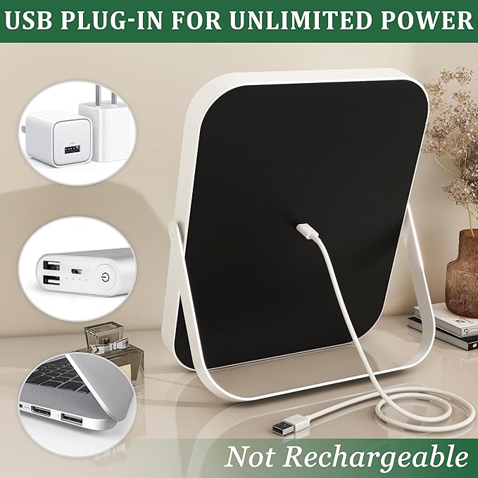 - NOTE: It's NOT rechargeable! The mirror needs to be plugged into a USB socket in order to utilize the light function.