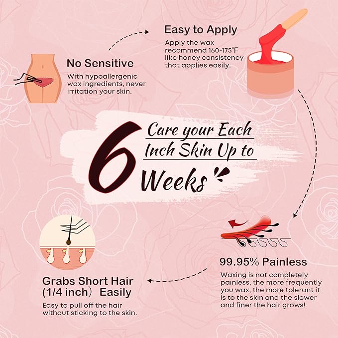 - Salon Results, Home Convenience: Experience salon-like results with hot wax hair removal in the comfort of your home. Our easy-to-use hard wax beans are perfect for beginners, providing long-lasting hair removal without strips, lasting up to 6 weeks - much longer than shaving