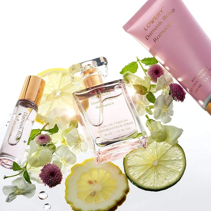 Mother's Day Womens Gifts, Birthday Gifts for Mom, Self Care Gifts for Women, Damask Rose Romance Spa Kit with Soy Candle, Perfume Roll On, Body Lotion, Body Mist & Eau de Parfum, Bath & Body Care Set