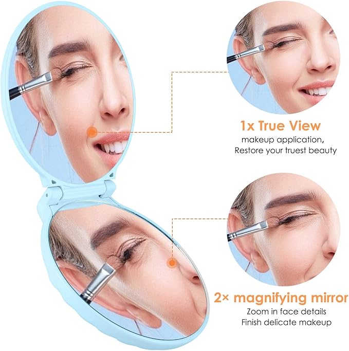 - 1X & 2X MAGNIFICATION - Unique purse mirror, dual sided 1X/2X Magnification. And the 2X magnifying mirror can see better the beauty details, perfect for applying mascara, wearing contact lenses, tweezing, shaving, plucking, hair styling, facial care. Folding pocket mirror, small and practical.