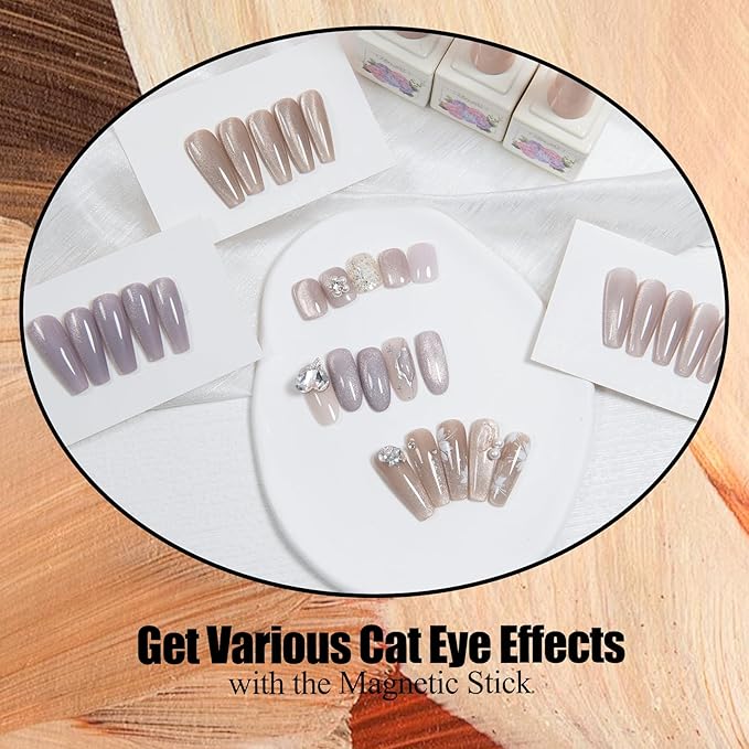 - HOW TO USE:Before applying, please shake the bottle slightly for better consistency.First use the base coat and cure,then apply cat eye nail polish gel and cure it,once again previous step and use the magnet to create out the effect you like and cured by led lamp,finally apply the top coat and cure