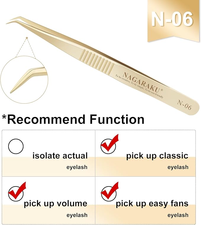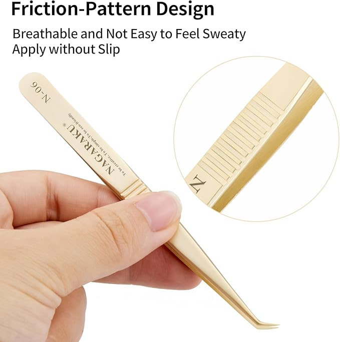 NAGARAKU Gold Tweezers for Eyelash Extensions Curved Angled Volume Cluster Super Light Weight Easy Fanning Tweezers Stainless Steel Precision (N-06)