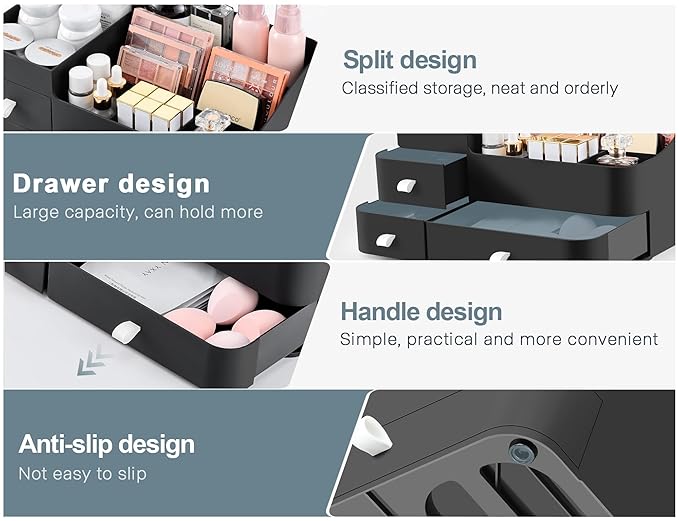 ONXE Makeup Organizer With Drawers,Large Countertop Storage for Cosmetics Elegant Vanity Holder for Brushes, Eyeshadow, Lotions, Lipstick, Nail Polish and Jewelry (black)