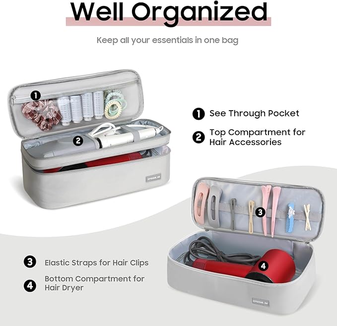 - 【Double-layer Large Capacity】The size of this dyson airwrap travel case: 15.7 in*5.5 in*5.9 in with two spacious compartments, a zippered transparent pocket on the top helps to store combs and small accessories, 1 mesh pocket with elastic for storage Curling iron or other hair tools. 7 elastic bands secure clips and other hair tools, keeping everything organized and within easy reach.
