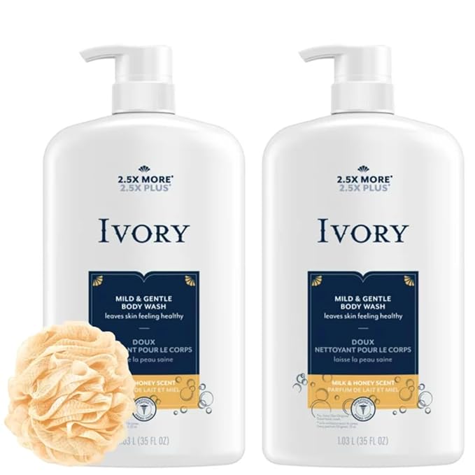 Ivory Body Wash - Ivory Clean Body Wash Pump Original with body pump. Ivory soap pamper yourself with this moisturizing body wash pump with 35 Fl. Oz. each with shower loofah (Pack of 2). (Milk and Honey)