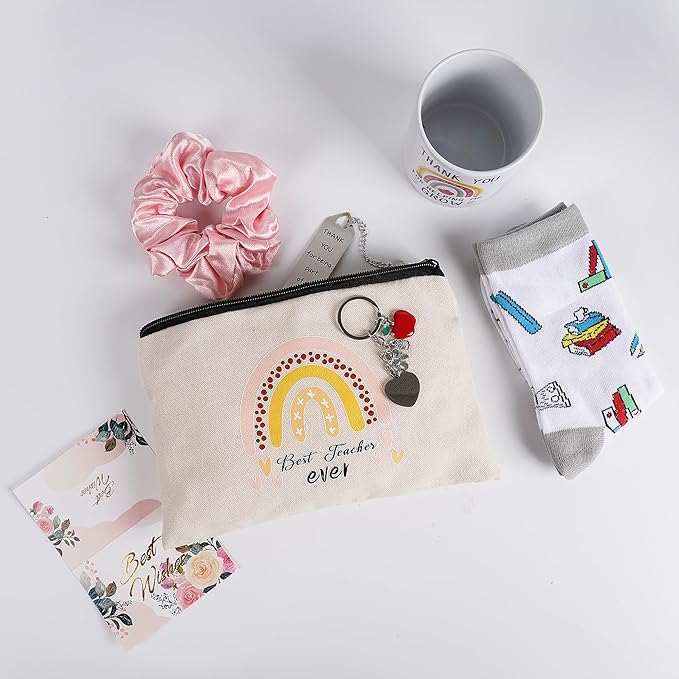 - Amount of product: you will get in total of 1pcs can glass, 1pcs bookmarks, 1pcs ceramic pen holder,1pcs makeup pouch cosmetic bag ,1pcs teacher keychain,1pcs rose bath sall ball, 1pcs bluebell candle,1pcs socks,1pcs sleep mask,1pcs scrunchies hair tie,1pcs soap,1pcs greet card,which is packaged in a beautiful gift box to be ready for gift giving, nice appreciation gift set for a new teacher, retiring teacher, favorite teacher, teacher's assistant or aide