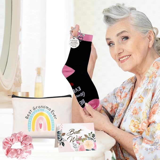 - Package include:you will get in total of 1pcs cup,1pcs makeup pouch cosmetic bag ,1pcs keychain,2pcs rose bath sall balls, 1pcs bluebell candle,1pair of socks,1pcs sleep mask,1pcs scrunchies hair tie,1pcs soap,1pcs greet card,which is packaged in a beautiful gift box to be ready for gift giving, nice appreciation gift set for your grandma