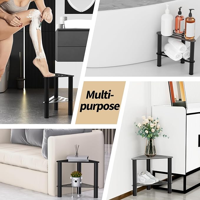 Metal Corner Shower Foot Stool for Shaving Legs, Shower Foot Rest Bench for Inside Shower with Storage Shelf, Small Step Stools, Waterproof Non-Slip Bath Stool to Sit (Black)