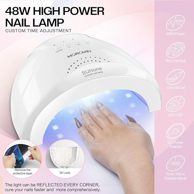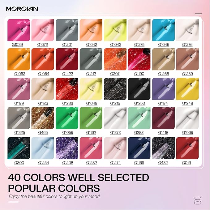 - Morovan GelALL in ONE GEL NAIL POLISH SET: This is a gel kit that 40 colors of nail polish, It includes black, white, nude, purple, blue, green, red, pink, yellow and other classic gel nail polish colors. Nail light, a bottle of base coat, top coat and matte top coat, nail stampers, nail file and other nail tools. nail gel polish, cost-effective, you can easily design your nails at home, perfect for nail art lovers. Nail Polish