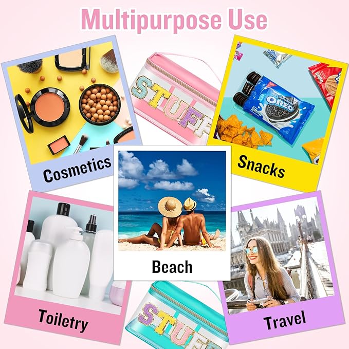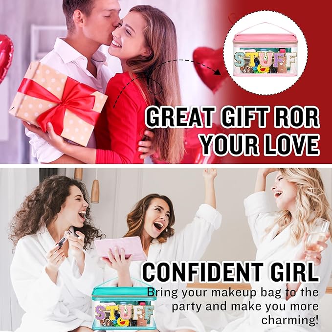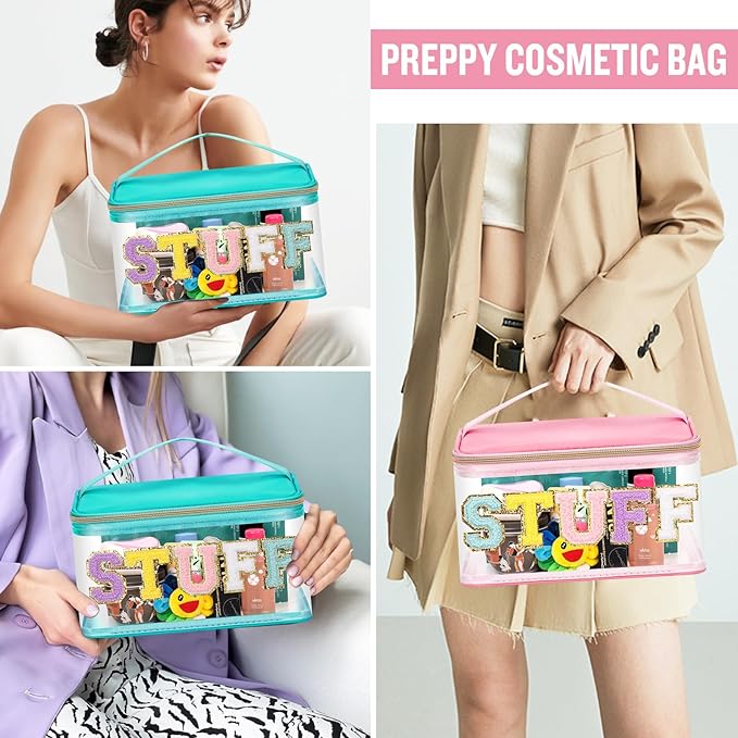 - ❤【Glitter Chenille Letter Clear Bag】2 PCS Preppy makeup bag pouch has gold glitter letter patches and the letters are made of delicate towel embroidery and non-woven fabric. Firmly stained on the bag, you don't have to worry about them falling off. These colorful letters have a gold glitter border to make your clear makeup bag look very bright and vivid!