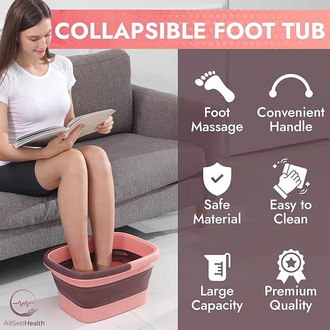 AllSett Health Collapsible Foot Bath – Advanced Foot Soaking Tub with Portable Design and Handle – Foldable Pedicure Foot Spa Bowl – Compact and Lightweight Foot Soak with Acupressure Points, Pink