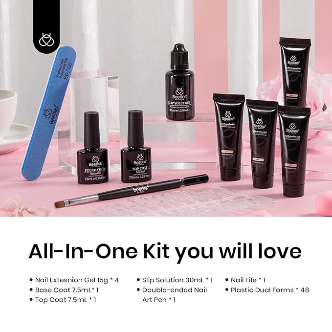 - 【Beetles Poly Nail Gel Kit】: Beetles 4 colors poly nail extension gel kit include 4*15g Hybrid gel, 7.5ml base&top coat set, 30ml slip solution, 48pcs dual nail forms, nail file, double-ended nail art pen. The flexible and portable nail kit comes with everything and is easy to carry, so you can do manicure anytime, anywhere at home or while traveling.