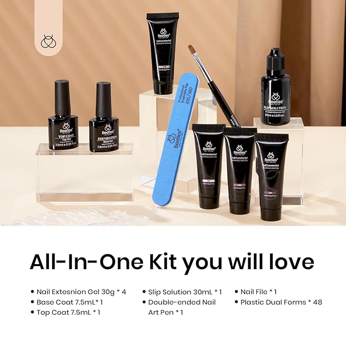- 【Package Includes】4*15g Poly Extension Nail Gel in 4 different colors, 48pcs nail molds in 12 sizes, 2*7.5ml Gel Base & Top coat, 1*Nail File, 1*30ml Slip Solution, 1*double-ended nail art pen.