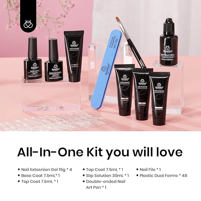 - Beetles Poly Nail Extension Gel Kit for Nails: If you extend your nails at a nail salon each time, you would need to spend roughly 2 hours ! Our extension gel kit, which includes everything you need to achieve gorgeous nails at home, will save your money and you’ll spend half the amount of time doing them! Plus, you don't need to go to the nail salon every time to change your manicure and you can enjoy the fun of DIY at home!