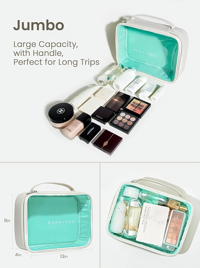 - 🏠 Jumbo for Home Luxury:13"x9"x4" soft faux leather case organizes vanity/bathroom essentials (hairdryer, 10 skincare bottles, 20 lipsticks). Matte leather exterior + clear panel = elevated storage, not plastic clutter