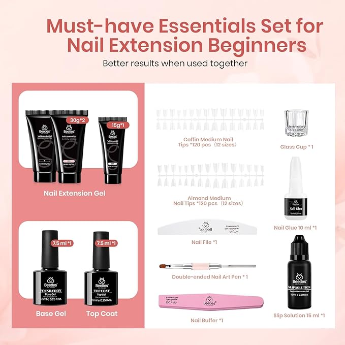 - 【Poly Nail Gel Kit with Nail Tips】Beetles New upgrade poly nail gel includes 3 French Nail Colors, clear nude nail extension gel 30g each, white nail extension gel 15g, Coffin Medium Nail Tips *120pcs (15 sizes), Almond Medium Nail Tips *120 pcs (15 sizes), 2*7.5ml gel base top coat set, Nail Glue 10 ml *1, Glass Cup * 1, Nail File*1, Double-ended Nail Art Pen *1, Nail Buffer *1, Slip Solution 15 ml *1. All-in-One Nail Builder Gel provides convenience for you to do nail salon anytime, anywhere.