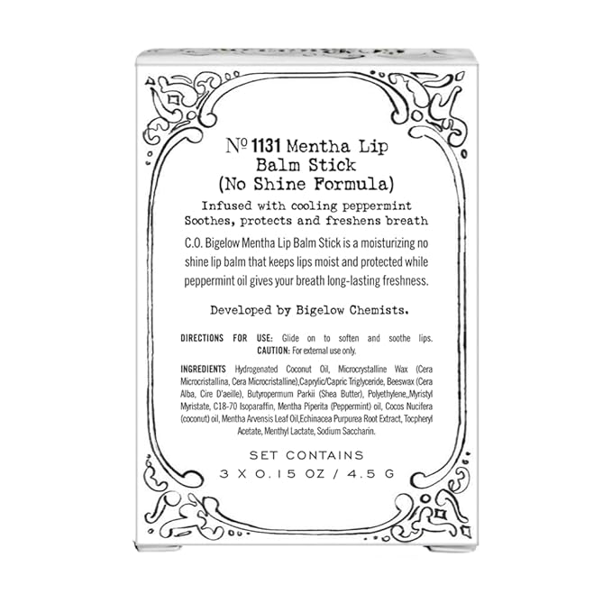 - SET INCLUDES (3) LIP BALMS No. 1131 Mentha Lip Balm Stick (No Shine Formula). Formulated by Bigelow chemists. Cruelty free, never tested on animals. Made in the USA.