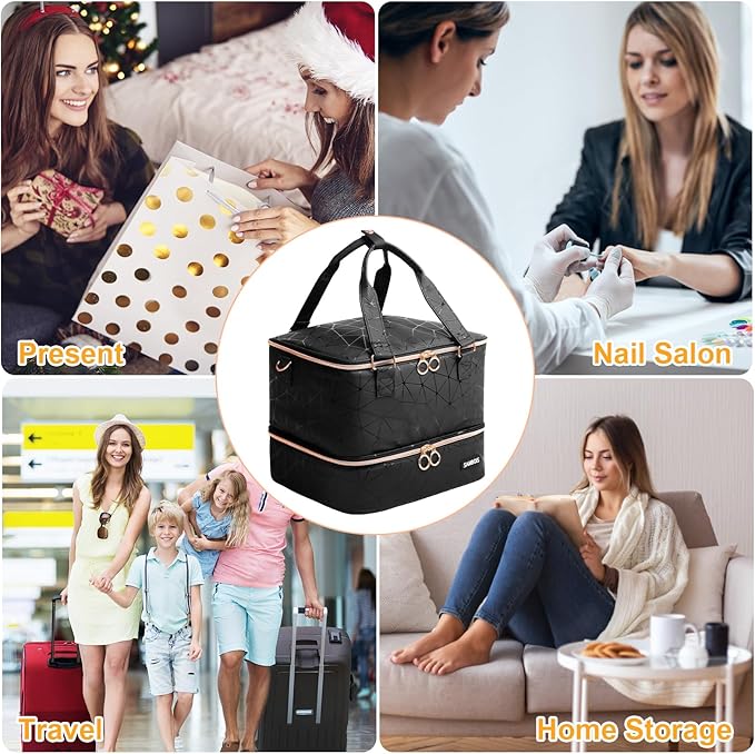 - NAIL POLISH ORGANIZERS and STORAGE BAG-DUAL LAYER LARGE CAPACITY: This large capacity nail polish organizer kit measures 11.42 in * 9.84 in * 9 in. Our nail travel case for nail tech has enough space and pockets to hold all your nail art supplies, including different models of standard specifications of nail lamps, nail polish, and keep them in a convenient location. There are two flexible and adjustable support straps on the top of the nail polish storage bag.