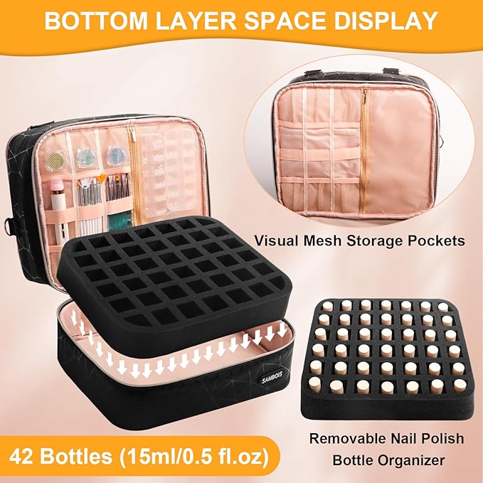 - BOTTOM SPACE of NAIL POLISH HOLDER ORGANIZER CASE: The bottom space of this gel nail polish organizer contains a large zippered mesh pocket, 6 small elastic pockets and 3 elastic bands for fastening. There is also a nail polish sponge organizer compartment that can hold up to 42 bottles [15ml/0.5 fl.oz], this nail polish sponge storage compartment is removable and detachable, convenient for you to store each of your small nail polish bottles.