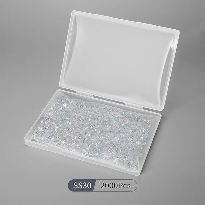 - Flatback Rhinestones Bulk: 2000 pieces per pack of Transparent AB Rhinestones, SS30, Size 6.4-6.6mm.