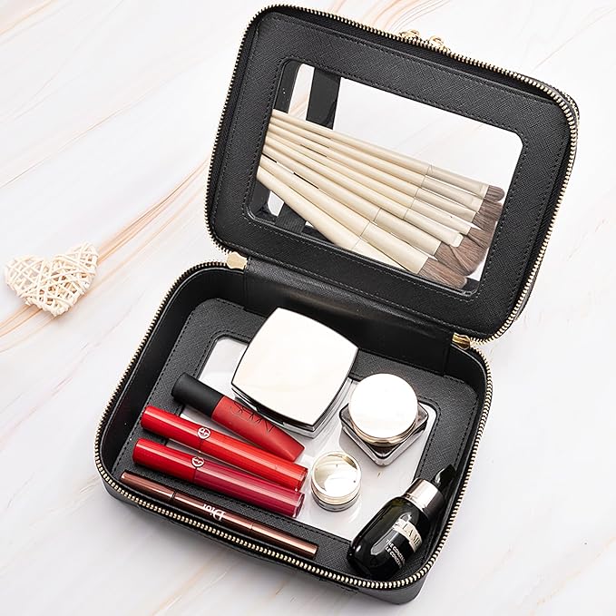 - ❤【STYLISH & PREMIUM QUALIYY】Unlike other flimsy and collapsible pvc bags, our 2-layer cosmetic pouch which made of premium saffiano PU leather and thick vinyl can keep a good structure. Together with the beautiful stitches and whisper-quiet metal zippers, this make up bag is durable for long-lasting use. It's the clear pouch you'd be happy with sitting out on display beside you.