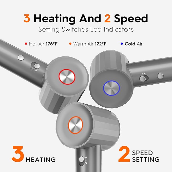 - 【Intelligent Heat 4 Temperature control & 2 speed 】Fentgo professional hair dryer 4 temperature settings (Cold, Warm, Hot, Alternate Cooling and Heating) as you like. 3 led ring lights (Blue /Red/Orange) indicate different temperatures. Red indicates 80 degree ,Orange is 50 degree, Blue is 25 degree. Press and hold 1s to active circulating mode, shifting hot & cold air every few seconds. 2 speeds control ( Low & High )