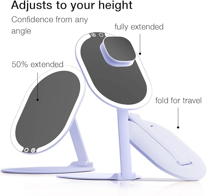 - Adjustable Height – Our travel mirror effortlessly transitions from handheld to vanity, allowing you to find the perfect viewing angle at various heights. No more uncomfortable hunching!