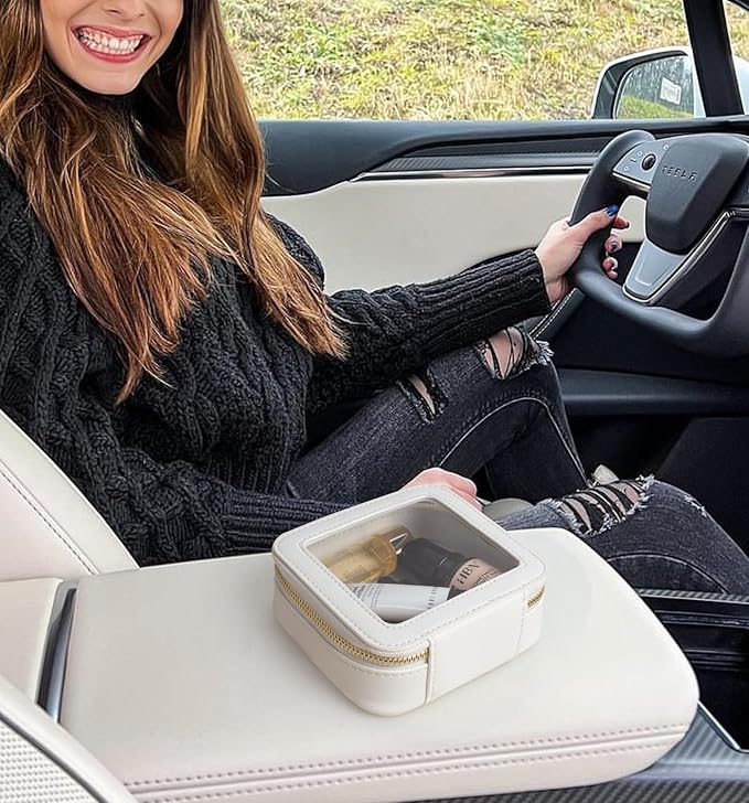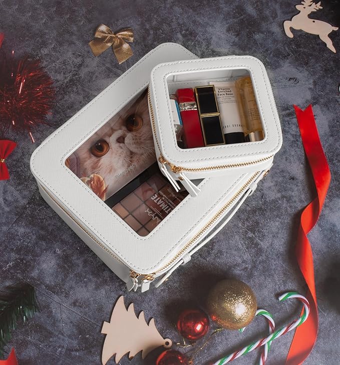 - ✈️CAR MUST HAVE ESSENTIALS CLEAR MAKEUP BAG : Large Size Measuring 9.84'' x 7.67'' x 3.14''(25cm x19.5cm x 8cm), Mini Size 5'' x 4.7'' x 2''(12.7cm x 12cm x 5cm), our clear makeup bag is elegant ,and stylish, this makeup travel organizer was designed in a minimalist boxy shape and Crafted in beautiful PU leather and finished with polished hardware, the trendy makeup bag is easy to carrying in your handbag or carry-on.