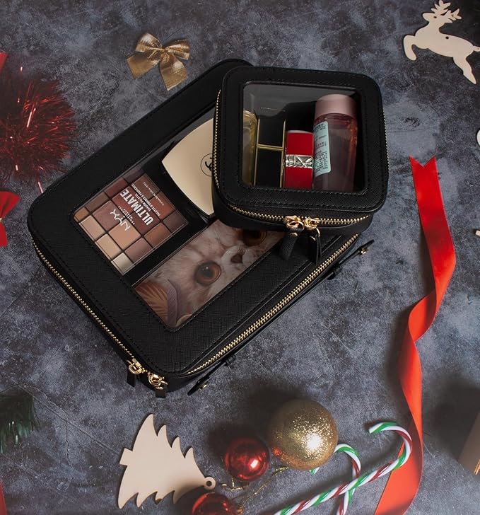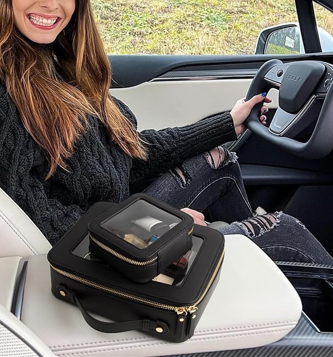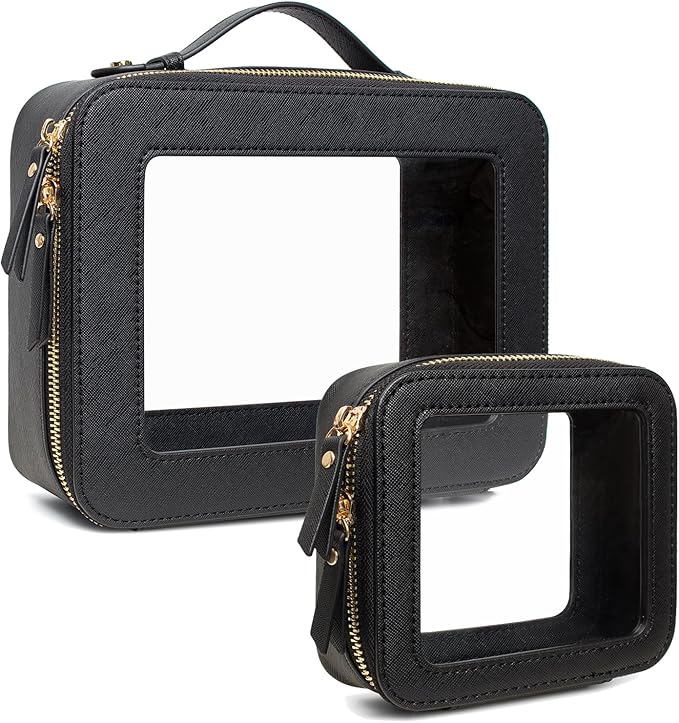 - ✈️CAR MUST HAVE ESSENTIALS CLEAR MAKEUP BAG : Large Size Measuring 9.84'' x 7.67'' x 3.14''(25cm x19.5cm x 8cm), Mini Size 5'' x 4.7'' x 2''(12.7cm x 12cm x 5cm), our clear makeup bag is elegant ,and stylish, this makeup travel organizer was designed in a minimalist boxy shape and Crafted in beautiful PU leather and finished with polished hardware, the trendy makeup bag is easy to carrying in your handbag or carry-on.