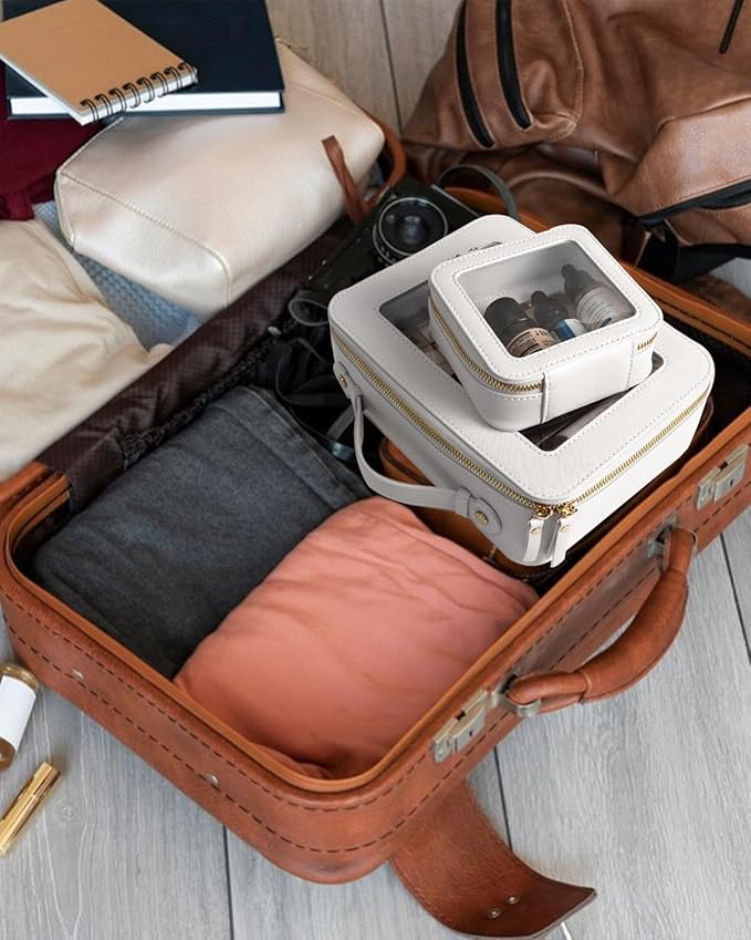 - Clear Design: Our 2Pcs Travel Makeup Bag designed in a minimalist boxy shape,is sleek and minimalistic look for your makeup accessories collection. And is designed with a transparent PVC window,all items are clear at a glance, and you can quickly choose the cosmetics you need.Portable and lightweight Slip it into your purse, backpack, everyday tote or travelling bag for easy access to your must-have items. Large: 9.44“ x 6.1” x 2.7”, Mini: 5'' x 4.7'' x 2''