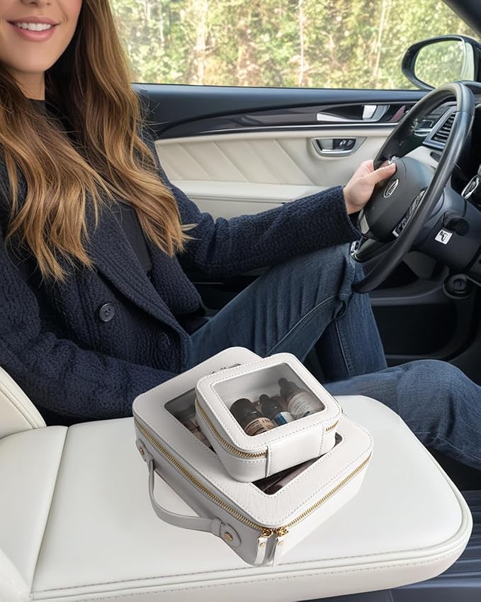 - Car Must Have Essential: Our large and small travel toiletry bag is roomy to store your makeup brushes, lipstick, eyebrow pencil, make-up foundation,skin care, cables, chargersor and other little items.It make your daily make-up, cream, lipstick, perfume and other beauty things organized and protected.This clear mini toiletry bag can be a good car accessory fits in the center console or other parts of your car