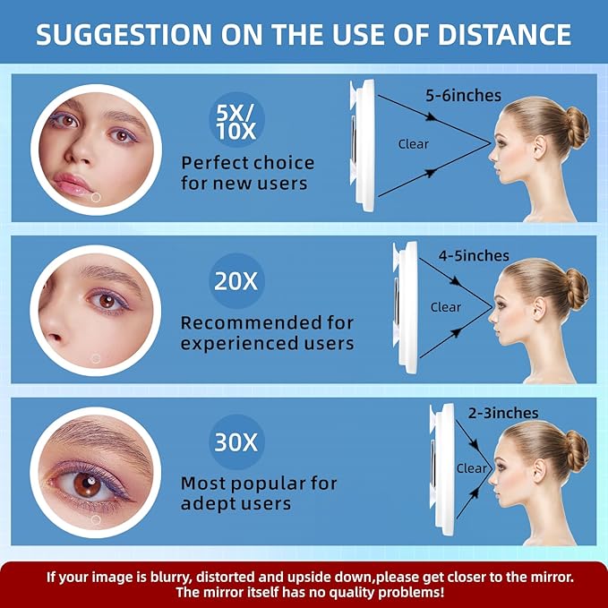 - 【Helpful Tip】The 5X magnification mirror is very powerful and best focus achieved 6inches from face. Upside down or distorted image from far away is normal, just move slowly until you get the best focus. This 5x magnifying mirror suction cup is perfect gift choice for wife, friends, mother and yourself!