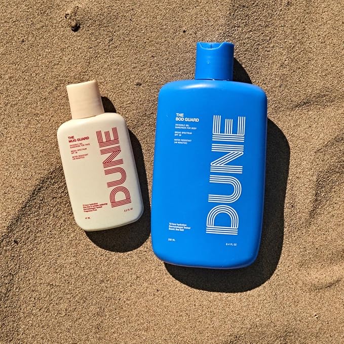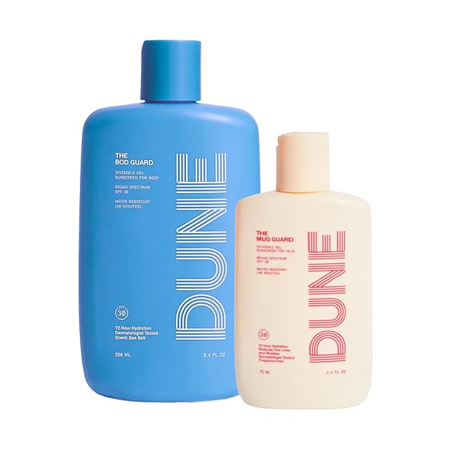 - DYNAMIC SUNSCREEN DUO: Get full face and body coverage with both DUNE Mug Guard and Bod Guard - the perfect dynamic duo. Mug Guard SPF 30 face sunscreen gel comes packed with skincare benefits for every mug, every day. Bod Guard's SPF 30 broad spectrum protection sunscreen protects skin’s appearance from the harsh sun with this refreshing sea salt scented sunscreen gel