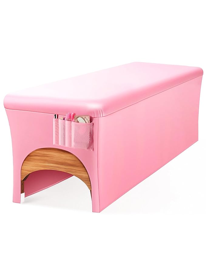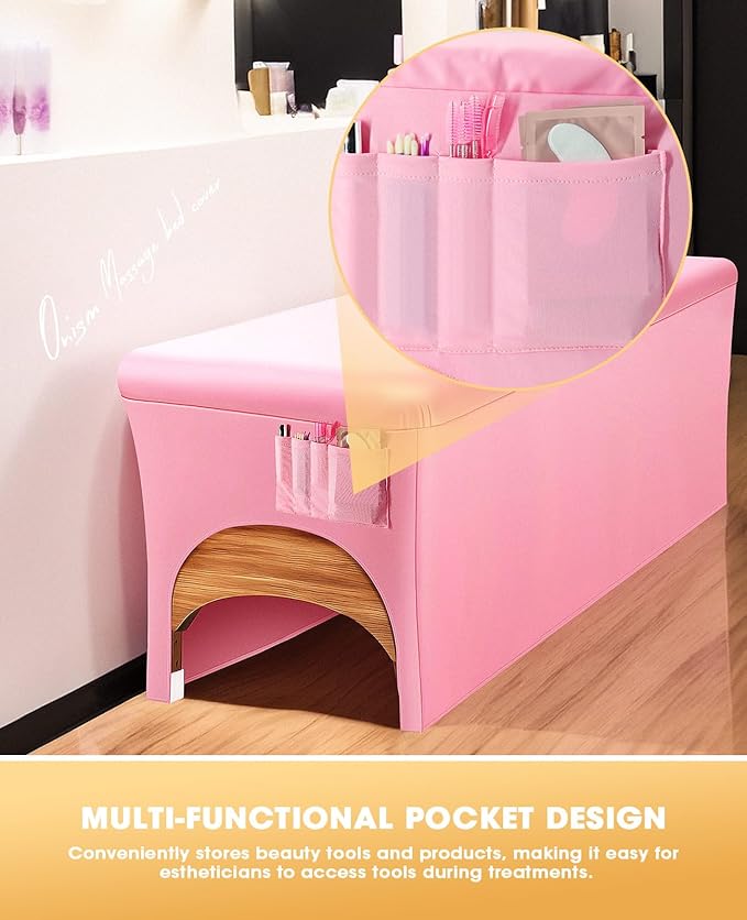 Onism Lash Bed Cover-Wipeable PU Leather Massage Bed Cover, Waterproof, Soft and Comfortable Spa Bed Cover with Storage Pocket for Eyelash Extension Bed Massage Bed Perfect for Salon Spa Home Use Pink