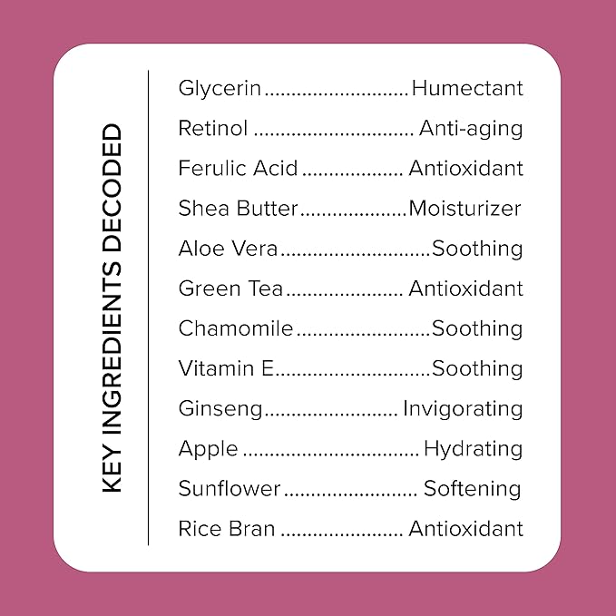 - Active Ingredients : Retinol, Ferulic Acid, Hyaluronic Acid